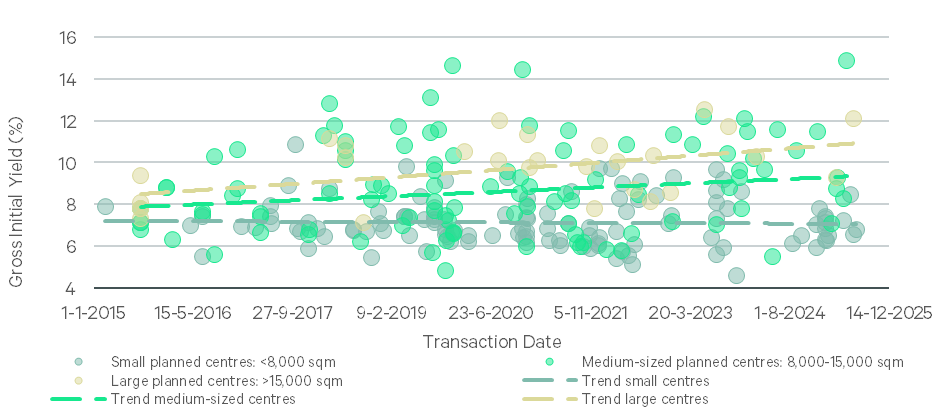 In 2015, gross initial yields for planned shopping centres typically ranged between 7% and 9%. By 2025, the differences are significantly greater: smaller centres show slight yield compression, while medium-sized and large centres offer higher yields of 8–10% and 10–12%, respectively. Now that the investment cycle has turned, an attractive entry point is emerging for investors looking to benefit from the current yield potential.
