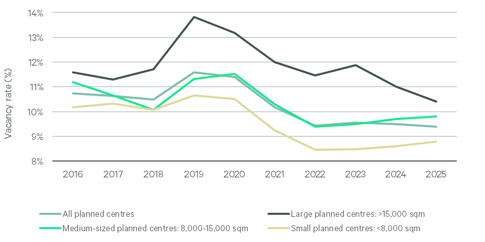 Vacancy trends 2015–2025Q2 by type of planned shopping centre