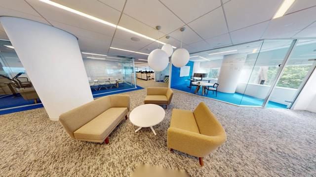 • Suite includes 15 private offices, 2 large conference rooms, 4 huddle rooms, 50+ workstations, storage room, break room, IT/data room, reception area, in-suite bathroom, and open soft seating areas