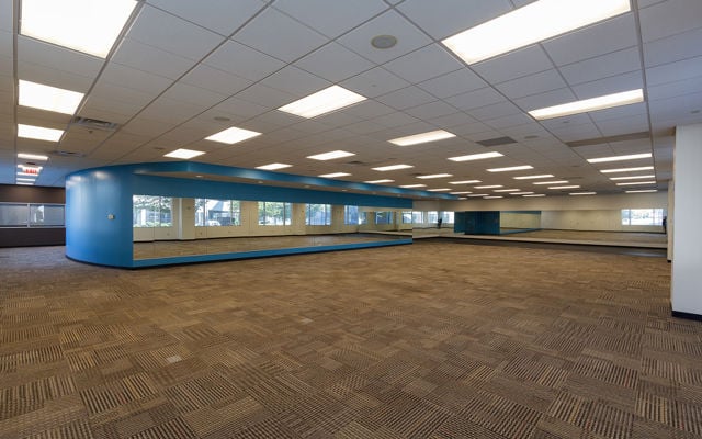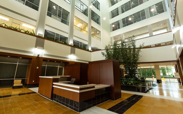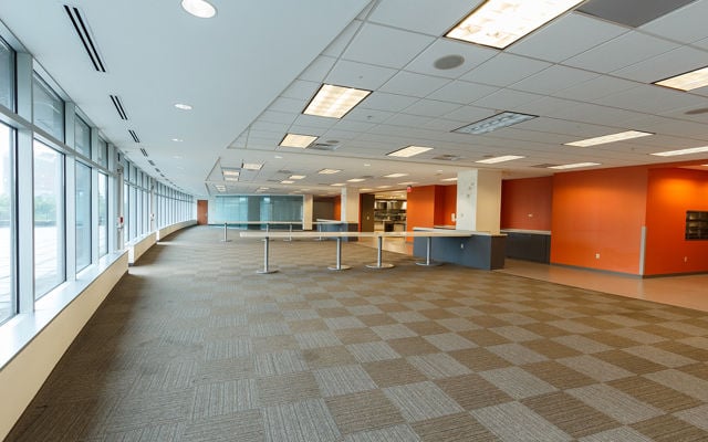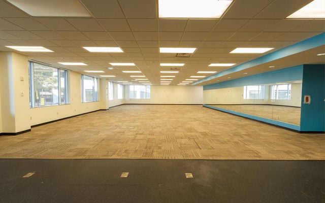 Among the spaces available for lease are a food service buildout with a large cafeteria and outdoor patio on the second floor as well as a former fitness center space adjacent to the visitor parking lot on the ground floor.